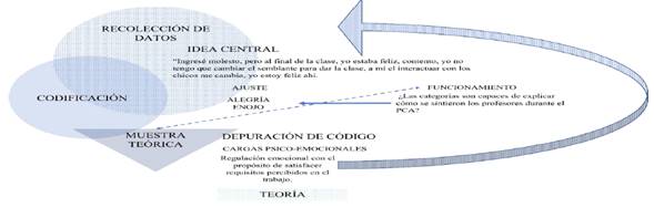 El desarrollo de la TF inició con la conceptualización previa del constructo satisfacción laboral, para favorecer la precisión en el análisis de los datos. La fase de recolección se apoyó en dos procesos, el ajuste y el funcionamiento, ambos, verificado a lo largo del muestreo teórico. El funcionamiento, se desarrolló mediante la formulación de preguntas a las categorías generadas, para verificar su capacidad de respuesta a lo investigado (ver Figura 3).