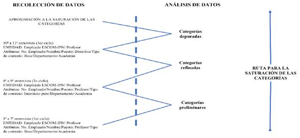 En total, el muestreo teórico estuvo constituido por tres ciclos, el primero, estructurado con 7 entrevistas dirigidas a la entidad “Empleado ESCOM-IPN”, cuyo atributo diferenciador fue el tipo de contratación, por lo que, convocó la participación de profesores basificados con tiempo completo (pTC). El segundo, integrado por dos entrevistas dirigidas a docentes interinos. El tercero, considero la diferencia entre el personal académico, a partir del atributo “Puesto”, por lo que se orientó hacia el personal directivo. El total de los datos se transcribieron e incorporaron al programa informático ATLAS.ti (ver Figura 4).
