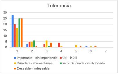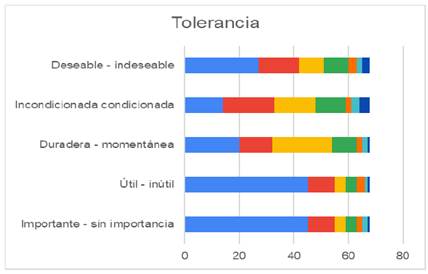 En la figura No. 1, podemos observar que más del 25 % de los alumnos encuestados de la licenciatura de Ingeniería en Agronomía para la Producción Sustentable, para el valor de tolerancia considera es importante, deseable y condicionada en su formación.
