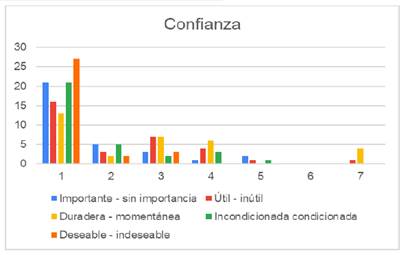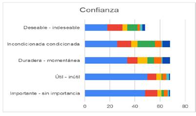 Con respecto al valor de la confianza, se puede apreciar que los estudiantes de la Licenciatura de Ingeniería en Agronomía para la Producción Sustentable más del 25 % consideran que es deseable en su formación profesional, seguido de un 20% que consideran que es importante e incondicional.