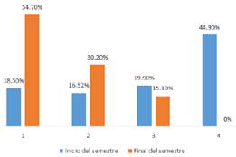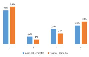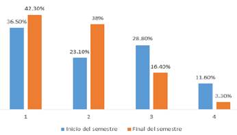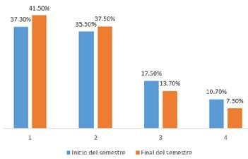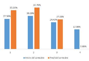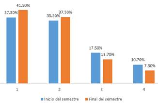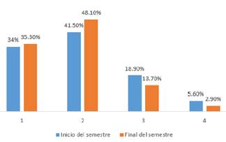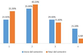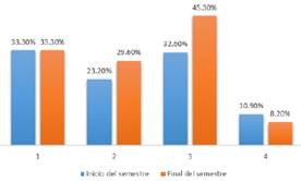 | Durante las clases me siento adormilado / a | Inicio del semestre | Final del semestre |