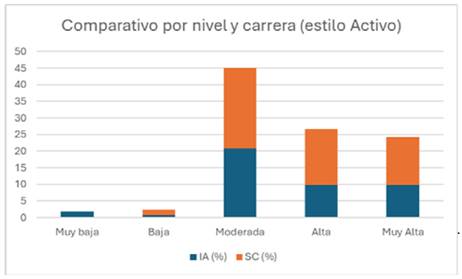 La preferencia moderada es la categoría predominante tanto en SC (≈ 24 %) como en IA (≈ 21 %). Aunque la carrera de SC mostró un porcentaje mayor tanto en el nivel de preferencia alto (≈ 17 %) como en el muy alto (≈ 15 %), en comparación con la carrera de IA, la cual mostró una fracción del 9.35 % para el nivel alto, así como para el muy alto. Lo cual podría indicar que los estudiantes de SC tienden a participar más en actividades prácticas o tienden a ser más participativos. También sugiere que el estilo Activo es moderadamente prevalente, con una inclinación ligeramente más alta en SC, lo que podría interpretarse como que las estrategias que incluyen actividades prácticas, dinámicas grupales y resolución de problemas son bien recibidas; en consecuencia, este patrón sugiere incorporar metodologías como el aprendizaje basado en proyectos, laboratorios prácticos, simulaciones y juegos de roles.