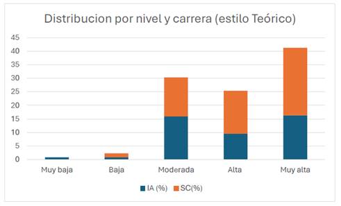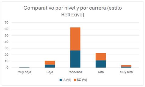 Es la categoría con mayor representatividad para ambas carreras, ya que el mayor porcentaje de estudiantes de ambas se ubica en un nivel moderado; aunque SC tiene un porcentaje un poco más alto (≈ 37 %), seguido por IA (≈ 30 %), lo que indica que la mayoría de los estudiantes en ambas carreras tienen una afinidad intermedia por este estilo, caracterizado por la observación cuidadosa, el análisis y la reflexión antes de actuar. Se encontró que los porcentajes en estos dos niveles son mayores en comparación con los otros estilos de aprendizaje. Este resultado sugiere que los estudiantes de ambas carreras tienden más a analizar situaciones antes de actuar, a planificar con anticipación y a reflexionar sobre sus experiencias. El estilo Reflexivo es, por tanto, el que muestra una mayor tendencia entre los estudiantes. Este patrón así se recomienda usar actividades como análisis de casos, diarios de reflexión y tiempo suficiente para la toma de decisiones y debates estructurados.
