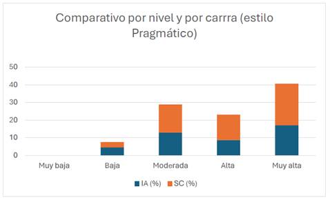 Este estilo tiene porcentajes mayores similares en ambas carreras en los niveles moderado y alto. Esto implica que los estudiantes de ambas carreras tienden a enfocarse en la utilidad práctica de lo que aprenden y en aplicar los conocimientos a diferentes situaciones. El predominio de este estilo sugiere una orientación común hacia la acción efectiva y la resolución de problemas reales en ambos programas académicos. Este patrón recomienda promover actividades orientadas a la resolución de problemas del mundo real, talleres prácticos y estudio de casos.