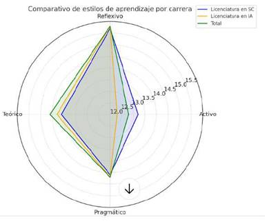 Se empleó el gráfico de radar para comparar los puntajes promedio de los cuatro estilos de aprendizaje (Activo, Reflexivo, Teórico y Pragmático) entre los estudiantes de las dos carreras (SC e IA). En la Figura 6 se muestra este gráfico, en el que la línea azul representa los promedios ponderados de la carrera de SC, la línea naranja representa los promedios ponderados de la carrera de IA y la línea punteada representa el promedio total general. Se observa que el estilo de aprendizaje que predominó en los estudiantes es el Reflexivo (M = 15.8), ocupando el segundo lugar el estilo Pragmático con un valor de M = 14.7. En tercer lugar, se ubicó el estilo Teórico (M = 14.6) y, por último, el estilo Activo con menor preferencia (M = 12.8).
