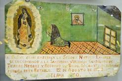 Figura 1 “Allandoce grabe emferma la Señora Natalia Ramirez se encomendo a la Santisima Virgen de Guadalupe de Tierras Negras y recobro su salud. En Gratitu de su milagro publica este retablo. 12 de Agosto de 1934, Celaya, Guanajuato”