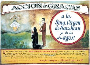 Exvoto 01: Con todo mi corazón doy públicamente las gracias a la Sma. Virgen de Guadalupe, porque desde el 12 de febrero del presente año me ha estado amparando, sacándome libre de peligros en que ha estado expuesta mi vida. Acudamos a la Santísima Virgen de Guadalupe y Ella, como madre cariñosa, nos amparará. Manuela Vda. De Carballo.27