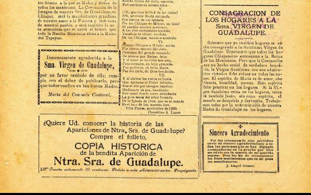 El mexicano por el mismo hecho de serlo, lleva en su corazón el amor a la virgen de Guadalupe. Hasta los impíos aman a la Virgen del Tepeyac, porque miran en ella el lazo más estrecho, quizá el único que une a todos los mexicanos, es el baluarte fuerte y seguro de nuestra independencia. Cooperemos pues, con nuestro óbolo como hijos agradecidos. Chiapas por la bondad divina, de manera especial, acaba de proclamar como su amantísima Reina, a Santa María de Guadalupe. Todavía vibran en nuestros oídos las entusiastas vivas que brotaron de los corazones agradecidos, al aclamar como Reina a la patrona de nuestro suelo: todavía palpitan de emoción nuestros corazones poseídos por el amor guadalupano. Que brotó pujante al coronar la imagen de Nuestra Señora de Guadalupe el 12 de mayo próximo pasado.22
