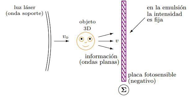 La holografía, o visión gráfica real, es un proceso de impresión especial con el que es posible generar imágenes ópticas tridimensionales de objetos físicos, grabadas por medio de luz láser sobre emulsiones sensibles, que reciben el nombre de hologramas. En la impresión de un holograma se graban con alto grado de exactitud las características visibles de algún objeto real sobre una placa o película fotosensible (emulsión) mediante un proceso de interferencia con ondas de luz planas y un montaje óptico con espejos y lentes.