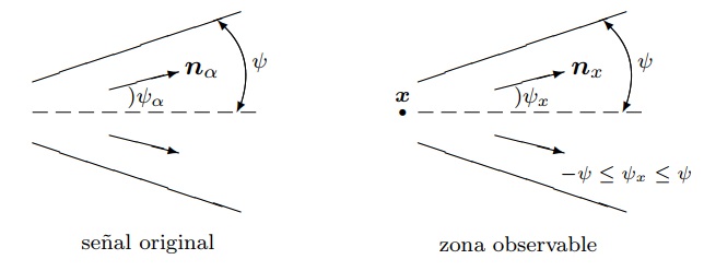 Al suponer que todos los ángulos de incidencia entre el eje del sistema y las componentes de la onda soporte, nα , satisfacen - ψψαψ (Figura 7), que la zona observable también está dentro del mismo rango para ψ y que la onda soporte v0=eikn0x tiene un ángulo ψ0 tal que sen ψ0>2 sen ψ , entonces el método de la fase estacionaria implica: