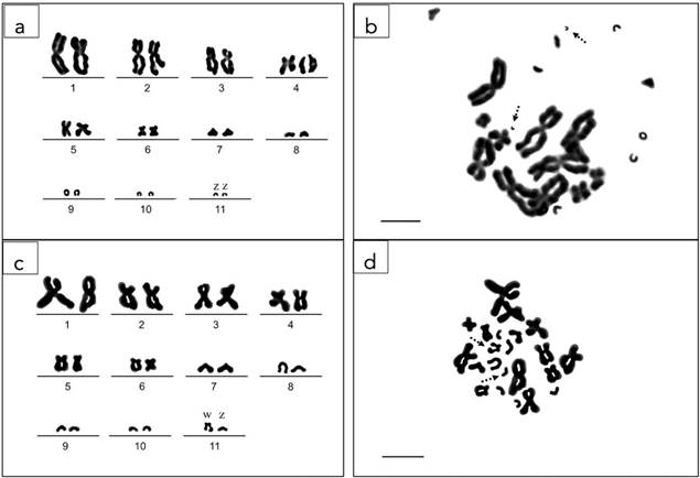 Figura 1 Cariotipo en mitosis, representativo de machos genéticos con cromosomas homogaméticos (ZZ) del sapo costero I. valliceps (a). Metafase con 2n= 22 cromosomas mitóticos (b). Cariotipo diploide de un macho fenotípico (macho no genético) con cromosomas genético sexuales de hembra heterogamética (ZW) (c). Metafase mitótica con 2n= 22 cromosomas (d). Las flechas discontinuas representan el par de cromosomas sexuales en cada metafase en b, d y las barras en b y d, representan 10 μm.