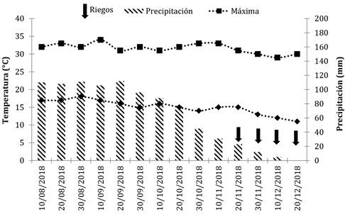 El ensayo se realizó de agosto a diciembre del 2018 en la unidad experimental del Instituto Tecnológico de Pinotepa, ubicado en el kilómetro 26 de la carretera Pinotepa Nacional, Oaxaca - Acapulco, Guerrero al sur de la población de San José Estancia Grande, Oaxaca (16° 21' 35.55" LN y 98° 14' 59.51" LO, a 60 msnm). De acuerdo con la clasificación climática de Köppen, presenta un clima Awo, que corresponde a un clima cálido subhúmedo con lluvias en verano (García 2004). La temperatura máxima se registró en el mes de septiembre con un promedio de 34 °C, mientras que la mínima fue en diciembre con 11.5 °C, por otra parte, la mayor precipitación se registró en los meses de agosto, septiembre y octubre con un acumulado de 924 mm y se realizaron riegos a capacidad de campo cada 3 días en los meses de noviembre y diciembre por la disminución de la precipitación dando 10 riegos con una lámina neta de 511 mm (Figura 1).