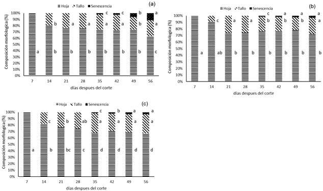 Los cambios en la proporción de hoja, tallo y material senescente son variables y están influenciados por la época del año y la edad a la que se cosecha el forraje (Rojas et al. 2016, Maldonado et al. 2019). Por otra parte, en las etapas fisiológicas avanzadas se incrementa el rendimiento de tallo, senescencia e inflorescencia, disminuyendo la cantidad de hoja, debido en parte por la translocación de nutrientes desde las hojas que resulta en la senescencia (Juskiw et al. 2000). Varios trabajos reportan mayor senescencia a mayor tiempo de rebrote por estar abajo del punto de compensación de la luz hasta que continuamente las hojas mueren como sucedió en esta investigación (Rojas et al. 2018, Maldonado et al. 2019, Rojas et al. 2024), iniciando la senescencia a los 35 días y aumentando continuamente hasta los 56 días.