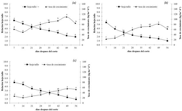 La relación hoja:tallo es un parámetro de calidad de los forrajes, sin embargo, cambia en función de la edad de rebrote y las condiciones ambientales (Torres et al. 2020). Mientras que Aguirre et al. (2022) en pastos de Urochloa reportan valores similares a los encontrados en este estudio, con un valor máximo para la relación hoja:tallo de 5.3 a los 7 días y un mínimo de 1.9 a los 56 días de rebrote. En tanto que Rojas et al. (2024) reportan que la relación hoja:tallo del pasto Mulato II fue mayor para las edades de rebrote entre 7 y 21 días, con un promedio de 6.1 (p < 0.05) disminuyendo drásticamente hasta la octava semana de evaluación, similar a lo reportado en esta investigación en pasto Mulato II. Por otra parte, Calzada-Marín et al. (2019) al evaluar el pasto Toledo Urochloa Brizanta reportan la mayor tasa de crecimiento a los 150 días de rebrote con 132 kg MS ha-1 día-1 mayor a lo reportado en esta investigación.