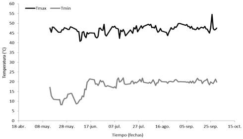 Figura 1 Temperatura máxima (Tmax) y temperatura mínima (Tmin) registradas durante el ciclo de producción de chile habanero en invernadero en el año 2020.