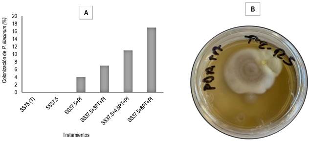 No se encontraron colonias de P. lilacinum en la rizosfera de plantas no inoculadas, en cambio con los tratamientos SS37.5+Pl, SS37.5+3PT+Pl, SS37.5+4.5PT+Pl y SS37.5+6PT+Pl se presentó colonización del hongo con valores de 4, 7, 11 y 17%, respectivamente. También, se observó un incremento exponencial de la colonización de P. lilacinum en función del aumento de la dosis del fertilizante Pez Terra® (Figura 2).