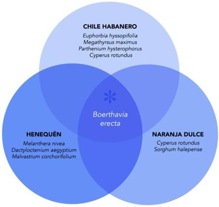 Tabla 2 Lista florística de las especies de malezas colectadas en los cultivos de chile habanero, henequén y naranja dulce.