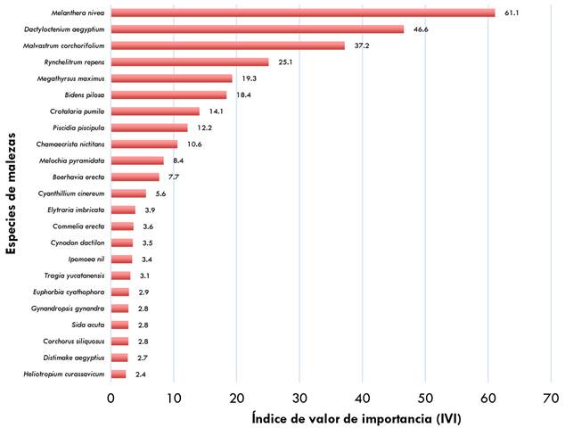 Se presentó una amplia diversidad de malezas en las parcelas estudiadas; entre los cultivos registrados, presentaron diferentes predominios de especies. En el caso del cultivo de henequén (A. fourcroydes), se detectaron veintitrés especies de malezas asociadas al cultivo. Mostrando un predominio de las especies Melanthera nivea (Asteraceae), Dactyloctenium aegyptium (Poaceae), y Malvastrum corchorifolium (Malvaceae), las cuales presentaron los mayores IVI (Figura 2). El cultivo de henequén en el estado de Yucatán se desarrolla tradicionalmente como un monocultivo, caracterizado por una baja inversión y con un uso limitado de insumos durante su desarrollo y producción. Esta condición favorece el crecimiento y la diversidad de maleza, como se observó en este estudio, donde se identificaron 23 especies asociadas a este cultivo. Esto coincide con lo expuesto por Quiroz-Medina y Bárcenas-Lanzas (2023), quienes señalan que la prevalencia de la maleza se atribuye al empleo de técnicas de manejo mecánico como el chapeo, que no logran erradicar estas poblaciones, mientras que, por otro lado, el escaso número de malezas se debe al uso de prácticas convencionales de manejo que involucran el uso de herbicidas tanto de contacto como sistémicos, lo que resulta en menor diversidad de especies en las parcelas.