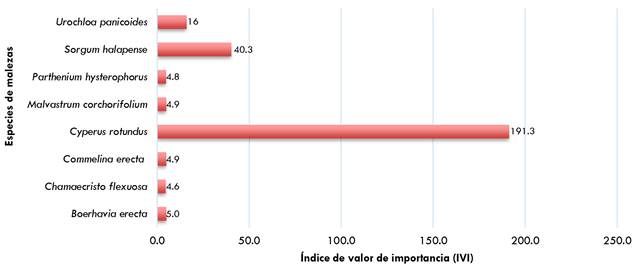 Por otro lado, en el cultivo de chile habanero (C. chinense), se detectaron 14 especies de malezas. Se observó un predominio de IVI de las especies Euphorbia hyssopifolia (Euphorbiaceae), Megathyrsus maximus (Poaceae), Parthenium hysterophorus (Asteraceae), y Cyperus rotundus (Cyperaceae) (Figura 3). El cultivo de naranja dulce (Citrus sinensis) presentó menor riqueza de especies comparada con los otros cultivos, con las siguientes ocho especies: hierba blanca (Boerthavia erecta), buulchich (Chamaecrista flexuosa), sak xiiw (Malvastrum corchorifolium), falsa altaniza (Parthenium hysterophorus), coquillo (Cyperus rotundus), zacate Johnson (Sorghum halepense), espuelitas (Commelina erecta), y pasto blanco (Urochloa panicoides). Las especies dominantes con el mayor IVI en el muestreo fueron: C. rotundus (Cyperaceae) y S. halepense (Poaceae) (Figura 4). Los resultados obtenidos en la plantación de chile habanero fueron distintos a la huerta de naranja, esto a pesar de encontrarse en el mismo municipio; en esta parcela se identificaron 14 especies de malezas. La notable diversidad de estas especies puede atribuirse a las prácticas agrícolas de la región, donde los agricultores no solo cultivan chile habanero, sino también otros cultivos anuales y perennes (Zapata-Aguilar et al. 2020). En este caso, el agricultor cultivó previamente cacahuate (Arachis hypogaea) en el ciclo anterior, y esta práctica de rotación de cultivos contribuyó a la variabilidad en las especies de malezas observadas. Por lo tanto, actividades de manejo agrícola como la selección de cultivos, las rotaciones y las prácticas culturales pueden desempeñan un papel crucial en la dispersión de las semillas o propágulos de maleza invasora, lo cual puede ocurrir en cada ciclo de siembra; como lo afirma Nowak et al. (2015), quienes indican que las prácticas agrícolas tienen estrecha relación con la composición de especies de malezas.