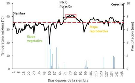 Las condiciones climáticas durante el desarrollo del cultivo fueron las siguientes: temperatura máxima desde 19 °C (50 DDS) hasta 41 °C (82 DDS) y precipitación total de 28.8 mm (Figura 1). Es importante mencionar que las temperaturas extremas (40 °C) se presentaron durante la polinización, tres días después del inicio de floración, recuadro rojo en la Figura 1, mientras que la línea punteada roja, indica la temperatura umbral máxima (35 °C), a la cual el maíz deja de crecer y desarrollarse (Lobell et al. 2013). De acuerdo con Ahmad et al. 2024, la temperatura ideal para maíz es entre 23 y 28 °C. En el presente trabajo y durante la etapa vegetativa, las temperaturas estuvieron por debajo de los 35 °C (Figura 1). Sin embargo, durante la polinización y parte de la etapa reproductiva las temperaturas estuvieron por encima de esa temperatura. Esto afecto de manera negativa la fertilización del ovulo, el llano del grano y el número de granos por mazorca, lo que provocó una reducción en el rendimiento del cultivo.