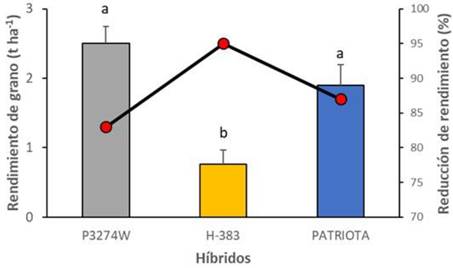 Figura 2 Rendimiento de grano en toneladas y reducción de rendimiento en porcentaje de tres híbridos de maíz durante el ciclo de primavera 2023, Matamoros, Coahuila, México. Letras iguales dentro de misma columna son estadísticamente iguales (Tukey P ≤ 0.05). Las barras verticales indican la desviación estándar.