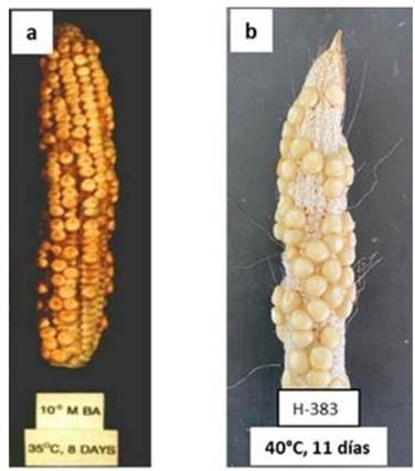 El peso de grano por mazorca promedio fue 10, 19 y 25 g para los híbridos H-383, PATRIOTA y P3274W, respectivamente. En lo que respecta al número de granos por mazorca los valores fueron 66 para el híbrido H-383, 126 para PATRIOTA y 166 para P3274W. Sin embargo, para efectos de la nota científica y ver el efecto de la temperatura extrema en el amarre en número de granos por mazorca, se tomó la variable cualitativa (Figura 4) en lugar de la variable cuantitativa. La Figura 4 muestra mazorcas en donde se aprecia el efecto en la formación de granos de maíz sometido a diferentes temperaturas y número de días durante la etapa de floración del cultivo. La Figura 4a muestra aún un buen número de granos por mazorca al someterse por ocho días a una temperatura de 35°C (Cheick y Jones 1994), mientras que la Figura 4 b muestra en el presente estudio, un reducido número de granos (40% menos que el híbrido P3274W) al someterse por 11 días a una de temperatura de 40 °C en el caso del híbrido H-383. Esto indica que la producción de grano del maíz es afectada negativamente no solo por altas temperaturas durante la floración, sino también por la duración y cantidad de días con esas condiciones. La combinación de estas dos variables ocasionó en este trabajo, una disminución del rendimiento esperado del cultivo hasta en un 95% (Figura 4 b).