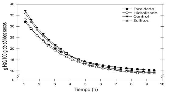 Curvas de secado. Se obtuvieron curvas de secado típicas (Pabis and Jaros, 2002) para cada uno de los pretratamientos aplicados a los cubos de papa (Figura 1). En general, se observan dos períodos durante los cuales ocurrió la pérdida de humedad. Uno es rápido y de velocidad constante durante aproximadamente las primeras 3.5 h, seguido de otro de velocidad decreciente que duró hasta que se alcanzó la estabilidad de peso a las 9.5 h. En las primeras 3 h del período rápido, se observa el mismo contenido de materia seca en los pretratamientos control y bisulfitos, así como en los correspondientes a escaldado e hidrolizado, siendo mayor en el primer par. Tales resultados significan que los pretratamientos escaldado e hidrolizado causaron menos pérdida de humedad durante las primeras 3 h, posiblemente causado por el colapso de los capilares en el tejido, dejando agua atrapada en ellos (Pabis and Jaros, 2002). Después del escaldado, se observó una consistencia gomosa en la superficie de los cubos de papa, posiblemente relacionada con la gelatinización del almidón presente, que formó una costra durante el secado y constituyó una barrera para la transferencia de humedad. En el caso del hidrolizado, aunque no se observó diferencia con respecto a la consistencia de la superficie, también podría haberse formado una barrera resistente a la pérdida de agua, debido a su composición, rica en polisacáridos y péptidos (Dehnad et al., 2016).