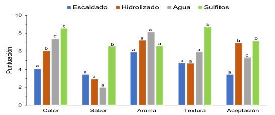 Evaluación sensorial de cubos de papa rehidratados y cocidos. Los resultados del ANOVA indican que hubo diferencias significativas (p < 0.05) entre los pretratamientos para todas las variables, excepto para el aroma (Tabla 4). En la Figura 2 se muestra gráficamente la puntuación dada por los jueces a los productos obtenidos de cada pretratamiento. La percepción del color fue más favorable para las papas pretratadas con bisulfitos y agua (control), no habiendo diferencias significativas entre ambos pretratamientos. El segundo lugar en la percepción del color lo obtuvo el hidrolizado, el cual fue significativamente diferente del escaldado y del par agua-bisulfitos.