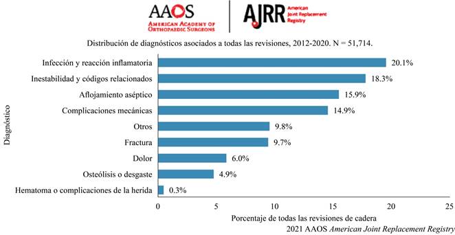 Figura 1: Se muestra que la inestabilidad y códigos relacionados están en segundo lugar como causa de revisión. Tomada de: AAOS American Joint Replacement Registry 2021.