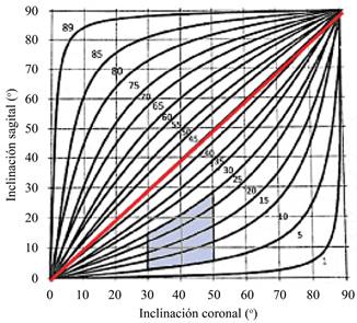 Algo muy importante en cuanto a la posición espacial del acetábulo es que, cuando la pelvis cambia de posición, la anteversión del acetábulo también cambia.27 Snijders y su grupo28 hicieron un estudio trigonométrico y elaboraron un algoritmo que define la orientación de la copa cuando se interrelacionan la inclinación coronal con la sagital, es decir, anteinclinación y anteversión. La Figura 10 muestra la interrelación que existe entre la inclinación pélvica coronal (eje X) y la inclinación sagital, también llamada anteinclinación (eje Y). Las líneas curvas muestran los resultados en anteversión. Cuando la inclinación sagital aumenta (eje Y), la inclinación coronal también aumenta (eje X) dando como resultado un incremento en la anteversión.