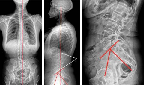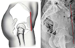 La importancia de esta medición en cirugía de cadera radica en el hecho de que el fulcro de la rotación (inclinación) pélvica son las cabezas femorales. Y cuando éstas se alejan o acercan a la línea de gravedad sagital, no sólo se puede alterar el equilibrio sagital global, por añadidura también la orientación del acetábulo. Para alcanzar un equilibrio sagital óptimo, debe alinearse el centro de las cabezas femorales con la línea de gravedad sagital. Entre más se acerquen mejor equilibrio sagital se logra. Observe en la Figura 16 que hay francas alteraciones estructuradas de la columna vertebral y que hay una amplia incidencia pélvica por lo que la pelvis rota hacia adelante, alejando el eje bicoxofemoral del centro de gravedad.