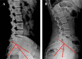 La lordosis lumbar normal es muy diferente de individuo a individuo y varía con la edad (disminuye después de la sexta década), el género (las mujeres tienen mayor grado de lordosis que los hombres), la posición y postura, el índice de masa corporal, la etnicidad, el grupo poblacional, el tipo de deportes practicados, la fuerza muscular, la elasticidad, los padecimientos de la columna vertebral por espondilólisis y espondilolistesis ístmica, etcétera.38,39 Aunque hay diversas variables para determinar el grado de angulación lumbar, en general se ha situado como valor normal entre 20o y 45o.39 Es importante recalcar que no hay un estándar universal para hacer mediciones referenciales.