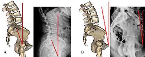 Figura 13: A) Sacro con menor pendiente = menor lordosis y mayor incidencia pélvica. B) Sacro con mayor pendiente = mayor lordosis y menor incidencia pélvica.