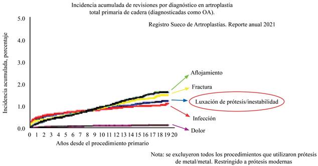 El evento de luxación representa un problema real en los resultados de este tipo de operaciones. En el año 2021 los reportes anuales de diferentes Registros Nacionales de Artroplastías, tales como el Registro Nacional de Reemplazos Articulares de la Asociación Australiana de Ortopedia8 (Tabla 1), el American Joint Replacement Registry9 (Figura 1) y el Registro Sueco de Artroplastías10 (Figura 2) colocaron respectivamente a la luxación como la primera, segunda y tercera causas generales más frecuentes de revisión.8,9