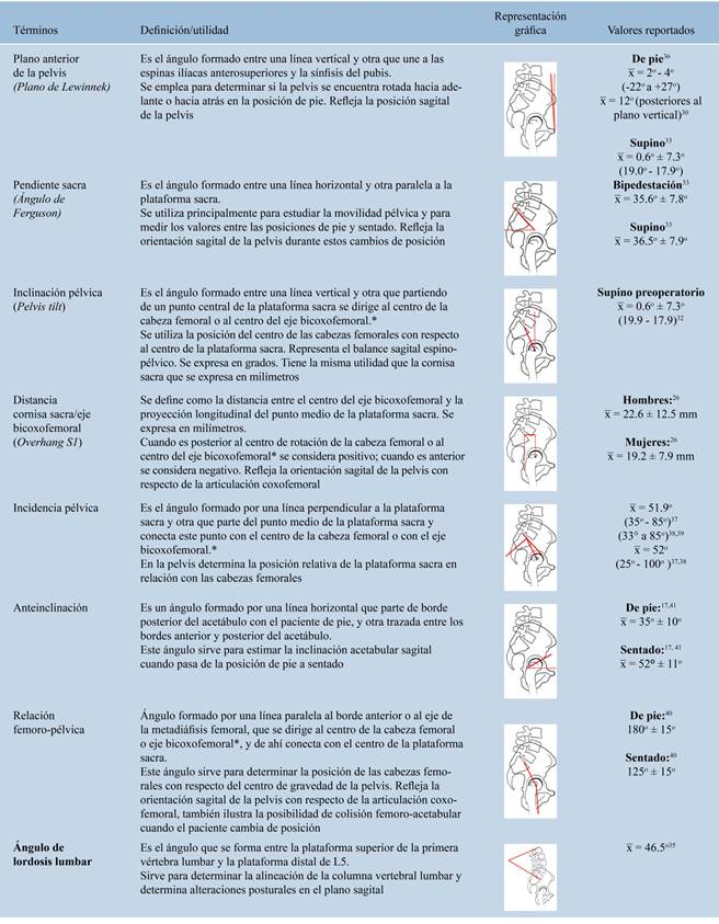 A continuación, se enuncian y definen algunos de los términos más frecuentemente utilizados: 1) plano anterior de la pelvis, 2) pendiente sacra, 3) inclinación pélvica, 4) cornisa sacra, 5) incidencia pélvica, 6) anteinclinación, 7) relación femoro-pélvica y 8) ángulo de lordosis lumbar (Anexo 1).