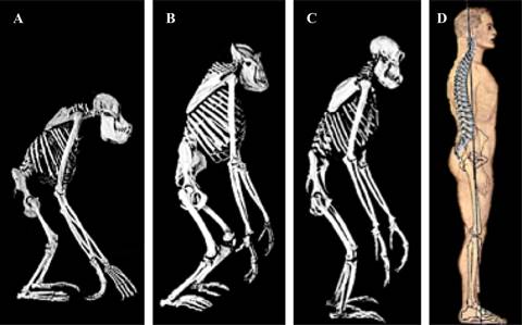 Figura 3: Anatomía esquelética axial comparativa entre simios: A) orangután, B) gorila, C) chimpancé y D) hombre moderno actual. Estas Figuras representan las diferencias posturales entre estos primates y el hombre contemporáneo.