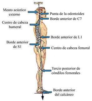Actualmente se acepta la definición de centro de gravedad o de balance global sagital como una línea que en plomada parte del centro del meato acústico, pasa por la punta de la apófisis odontoides, sigue por el borde anterior de la vértebra C7, por el centro de la cabeza humeral, el borde anterior de L1 y S1, continúa por la parte centro-ventral de la plataforma sacra, centro de la cabeza femoral, tercio posterior de los cóndilos femorales y termina en el borde anterior del calcáneo, o en el centro de éste (Figura 4). Debe mencionarse que otros autores no están totalmente de acuerdo con esos puntos de referencia. Por ejemplo, Roussouly24 toma como puntos de referencia el centro de la vértebra C7 o de T1, la línea sagital y se dirige al platillo sacro sin especificar su nivel. Un hallazgo descrito por Schwab y colaboradores25 fue que la línea longitudinal del plano sagital cuando parte de C7 se desplaza ventralmente conforme avanza la edad, y que esta línea se sitúa siempre adelante de la columna vertebral en todos los grupos estudiados. También observaron que la ubicación del centro de gravedad con respecto a los talones permaneció siempre constante a pesar de la edad, y que mientras que la pelvis se movía posteriormente con respecto a los talones, se experimentaba una pequeña inclinación pélvica. Para ellos, el centro del acetábulo fue el marcador radiográfico más confiable para la ubicación del centro de gravedad.