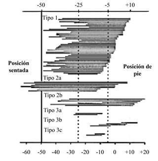 Estos autores también identificaron tres tipos de movilidad lumbo-pélvica y las agruparon según su frecuencia de presentación: tipo 1 o normal en 66%; tipo 2 o hipomóvil que dividieron en dos subgrupos: el tipo «a» con una basculación anterior (11%) y el tipo «b» con una basculación posterior (11%). Por último, el tipo 3 o columnas rígidas que las subdividieron a su vez en tres subgrupos: «a» con basculación anterior (2.5%); «b» con basculación posterior (6.0%) y «c» con basculación mixta (3.5%) (Figura 9).