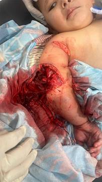 Figura 1: Niño de tres años con trauma severo en miembro superior. La mirada trasmite temor ante el daño sufrido.