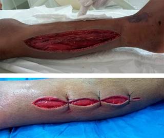 El primer caso fue derivado a nuestro servicio con historia de 12 horas de evolución, recibiendo 12 unidades de suero antiofídico previo al traslado. Paciente con diagnostico agregado de coagulación intravascular diseminada, por lo que requiere cuidados en la Unidad de Terapia Intensiva posterior a su fasciotomía de la pierna derecha, que se realiza a las 16 horas del evento. El procedimiento quirúrgico realizado fue de dos incisiones transversales, liberando todos los compartimientos de la pierna, no se constató en el acto operatorio necrosis de la musculatura. En su evolución, se efectúan nuevos lavados quirúrgicos en tres oportunidades posterior a la fasciotomía, realizándose el cierre de ésta a los 18 días del ingreso al hospital (Figura 2).