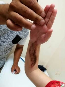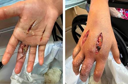 El segundo caso, paciente femenino de 12 años con historia previa de tres horas de evolución, presenta signos y síntomas de síndrome compartimental en la mano afectada. Se realiza fasciotomía de descarga a las nueve horas del evento, con dos abordajes en dorso y dos en palma, además de una incisión en zeta en cara volar del tercer dedo de la mano, zona donde ocurrió la mordedura de la serpiente (Figura 3). Requiere cuidados en terapia intensiva por alteraciones renales y la presencia de hipovolemia. Se realizan dos lavados antes del cierre de la fasciotomía.