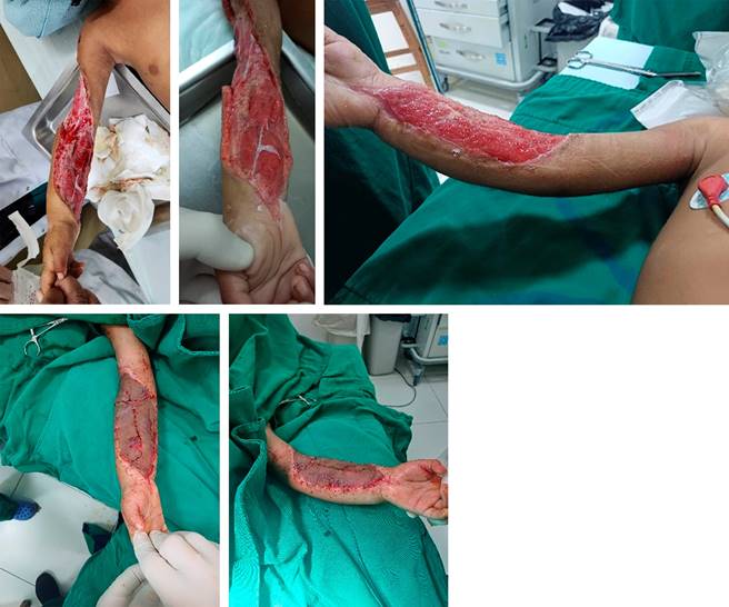 El tercer caso corresponde a un niño de tres años, con historia previa de 18 horas de evolución, recibe suero antiofídico a las cuatro horas del evento. Al llegar a nuestro servicio, se realiza el diagnostico de síndrome compartimental de miembro superior izquierdo con afectación de las tres regiones anatómicas (mano, antebrazo y brazo), además se acompaña de discrasia sanguínea y choque hipovolémico. Se realiza las fasciotomías de urgencia y es derivado a la Unidad de Terapia Intensiva para el manejo clínico correspondiente (Figura 4).