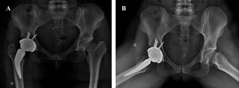 Se utilizaron las tres zonas descritas por DeLee11 para ubicar, en caso de aparición, las líneas radiolúcidas. El aflojamiento acetabular se definió como la progresión de líneas radiolúcidas en tres radiografías de controles consecutivos, la migración de la copa acetabular > 5o o la ruptura de tornillos.