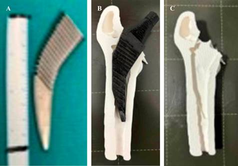 Figura 6: A) Vástago femoral y medidas, B) modelo de fémur y vástago, C) modelo femoral con labrado posterior a raspas.