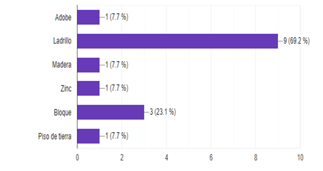 Finalmente, para este punto se concluye que son pocas las viviendas que están construidas o que permanecen actualmente con infraestructura de materiales de baja calidad como madera (7,7%), adobe (7,7%) o que tienen piso de tierra (7,7%); los materiales que predominan son ladrillo (69,2%) y bloque (23,1%).