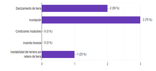 Respecto a los riesgos de desastres u otros que se presentan en las viviendas del barrio Cagua 1er sector, las cifras arrojan que un 69,2% de los encuestados no presenta condición alguna de riesgo, lo que es un punto positivo teniendo en cuenta las condiciones del terreno y las actividades que se ejecutan en cercanías, sin embargo, se debe prestar atención a los riesgos señalados por el 30,8% restante de los encuestados, de los cuales señalan en gran medida riesgos relacionados con inundación (75%), deslizamiento de tierra (50%) e inestabilidad del terreno (25%), esta última, debido a que para poder construir en el terreno se debió hacer una clase de relleno de tierra que actualmente supone problemas relacionados con los otros riesgos señalados.