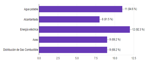 En el apartado de servicios públicos domiciliarios se evidencia que la mayoría de vivienda cuentan con agua potable (84,6%), alcantarillado (61,5%), energía eléctrica (92,3%), aseo (69,2%) y distribución de gas combustible (69,2%); pues más del 50% de los encuestados cuenta con varios de los servicios mencionados, sin embargo, es de aclarar que los únicos servicios por los que se paga una tarifa es el gas combustible, aseo y la energía eléctrica como lo explicó la población encuestada, para los otros servicios como agua potable y alcantarillado se han hecho conexiones irregulares para abastecerse de este servicio esencial.