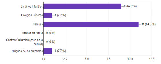 En cuanto a servicios públicos que se ofrecen en equipamientos colectivos, en su mayoría hay presencia de parques (84,6%) y jardines infantiles (69,2%), mientras que se presenta poca presencia de colegios públicos (7,7%) y uno de los encuestados afirma que no hay ninguno de los equipamientos mencionados en el barrio, esta última puede deberse a falta de conocimiento. Hay una deficiencia de equipamientos que son esenciales como centros de salud y centros culturales que contribuyen al bienestar y desarrollo de los habitantes del barrio Cagua 1er sector.