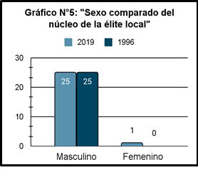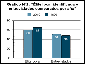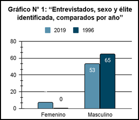 En el año 1996 para identificar a la élite se aplicó el método posicional y reputacional, en total se identificaron a 65 individuos y 48 fueron entrevistados (73,8%). La composición de la élite identificada de ese año fue solo de individuos de sexo masculino. En 2019 se aplicaron igualmente ambos métodos y se identificó a 60 individuos de los cuales se entrevistó a 51 (85%). En la composición de la élite 2019 se evidencia un cambio importante pues emergen integrantes de sexo femenino con 7, siendo todas entrevistadas (Figura 2).