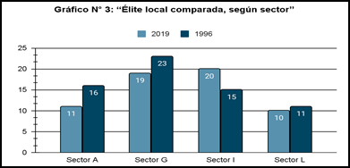 El sector con más representación es el G (político-administrativo) de 1996 a 2019 se mantiene prácticamente igual solo disminuyendo de 10 a 9, lo que es normal debido a que la élite política al estar en el aparato político-administrativo posee el poder legal y político para imponer sus decisiones por sobre el resto. Los demás sectores están equilibrados en representantes. El sector A (económico) del año 1996 al 2019 varía en dos individuos disminuyendo su protagonismo hoy en día, al menos en el grupo de más influencia. Por su parte el sector I (social) mantiene la cantidad de representantes desde 1996 con 5 integrantes lo que reafirma que los individuos que pertenecen a medios de comunicación, organizaciones locales, partidos políticos en una comunidad local son actores relevantes en las relaciones locales de poder e influencia.